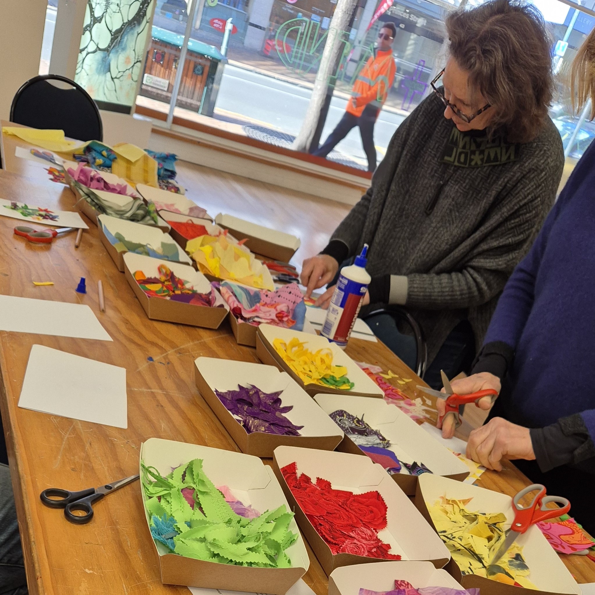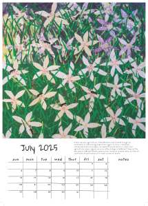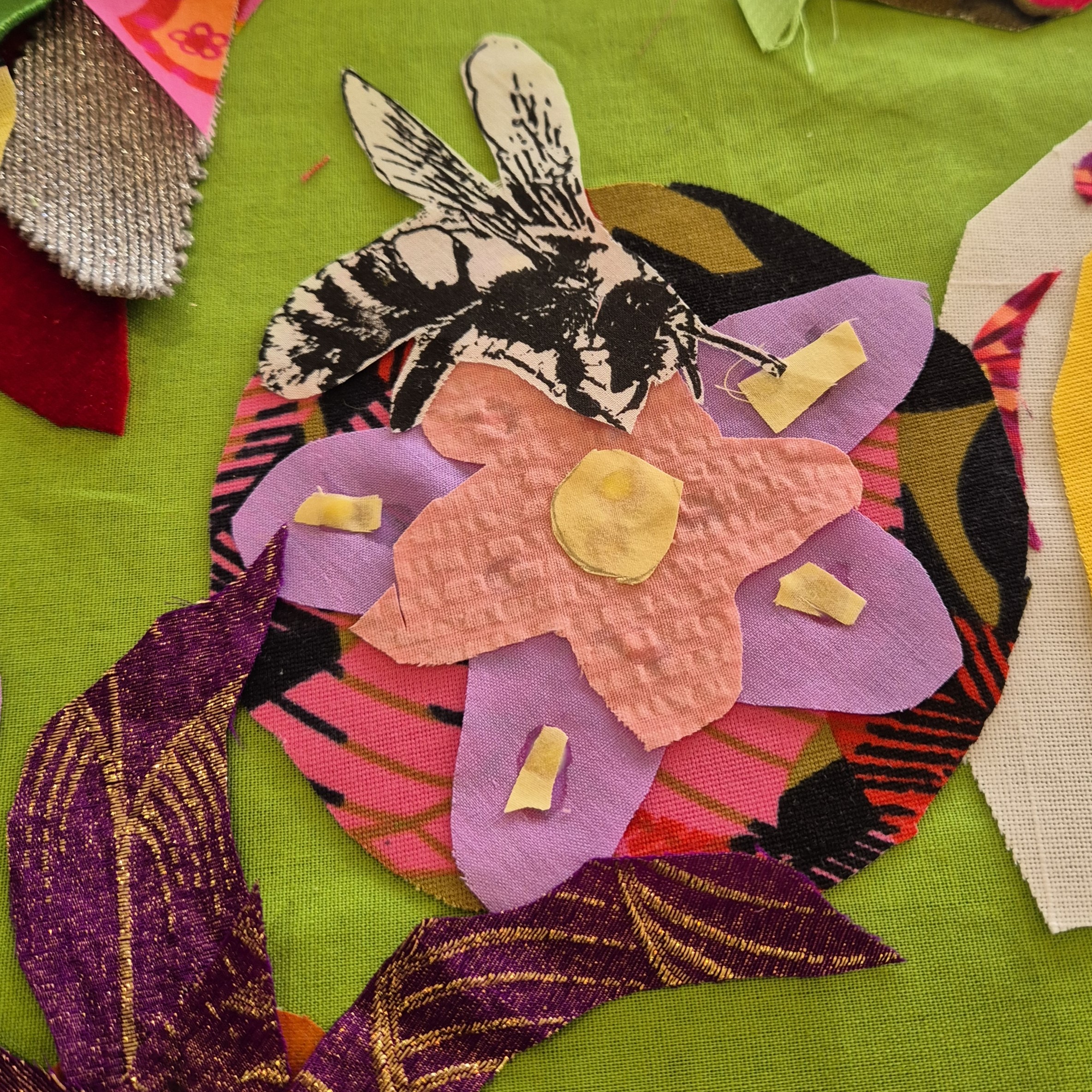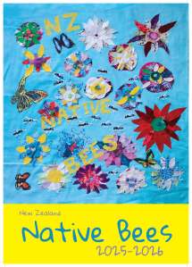 Thanks to funding from The Otago Participatory Science Platform, Jenny worked with Pam McKinlay (Otago Polytechnic) to run a series of “BEE Creative” workshops (July – September 2024). These workshops were designed to provide a fun way to share info about bee diversity and conservation. Students learned how to do screen printing and/or created flowers out of repurposed fabrics that could be added to a collage promoting a healthy bee environment. We chose 16 of these beautiful collages that capture the importance of planting a diverse assortment of flowers to feed ngaro huruhuru | native bees of Aotearoa, and created a 15-month calendar.