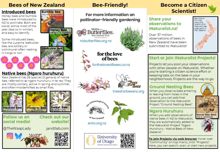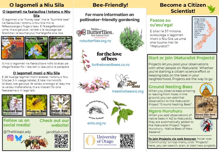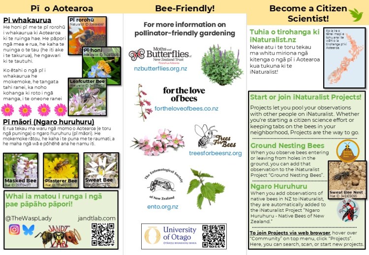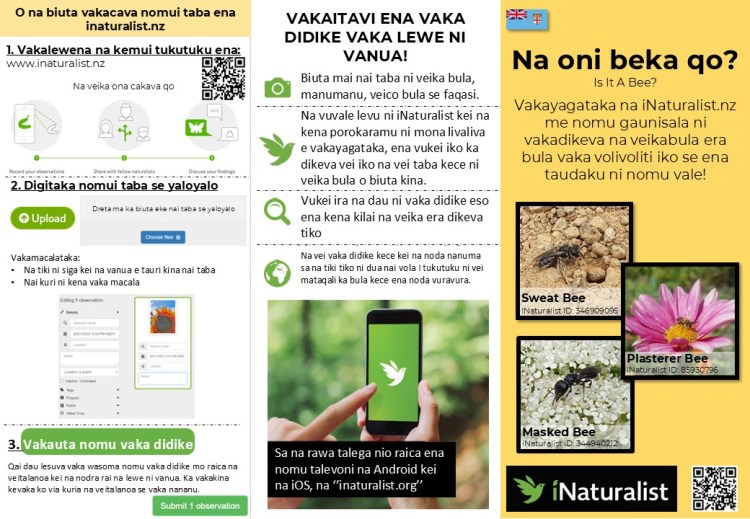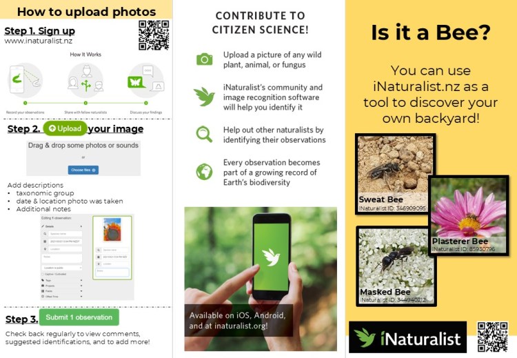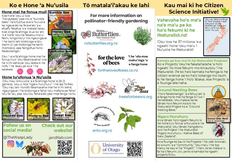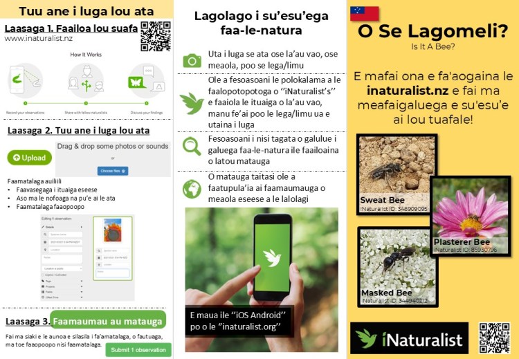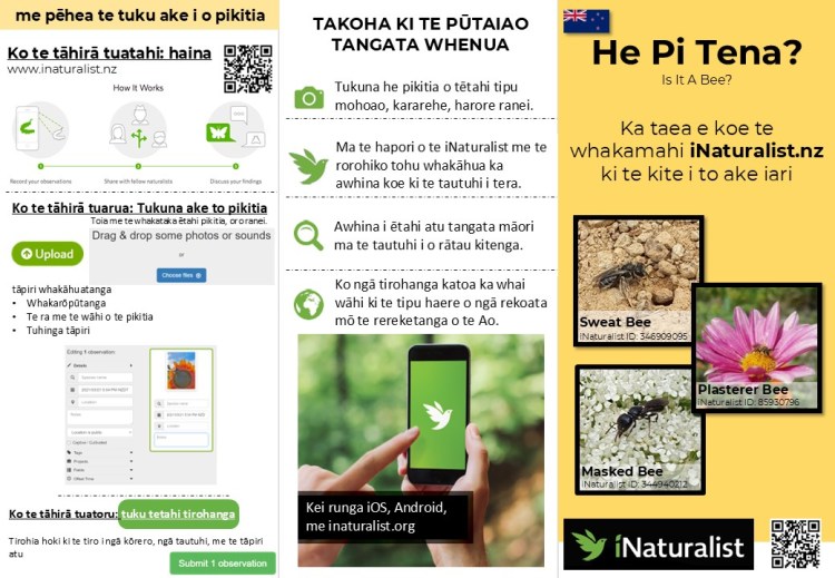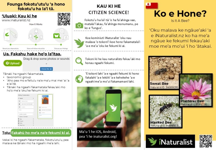We have created brochures “Is it a Bee?”, and had them translated into Māori, Tongan, Fijian, and Samoan to help guide people on how to use iNaturalist.nz, and to encourage people to upload observations they might find of bees and other pollinating insects. For our research, we use the data from iNaturalist.nz to get a clearer understanding of bee species distributions throughout NZ, times of year that different species are active, and what types of floral resources they are most commonly found feeding on.