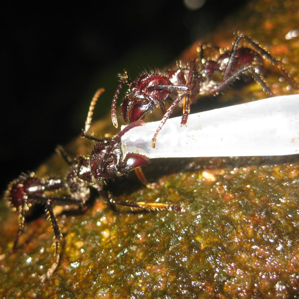Bullet ants (Paraponera clavata) are named because if they sting you, it’s supposed to feel like you’ve been shot by a gun. They’re big tropical ants, that mostly forage in the forest canopy. In this experiment, we added casein, a protein supplement, to different concentrations of sugar water. We found that when sugar content was low, but protein content was high, wasps were more likely to bite at the the liquid, instead of using their mandibles to gradually drink it. To read more about this study, click here. To learn more about studying tropical ants, check out research being done in Terry McGlynn’s lab.