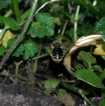 The bee shown above (in the bee family Halictidae; Order Hymenoptera) nests in the ground. As a solitary bee, she is responsible for feeding and protecting her young by herself. After I rearranged some of the weeds in the garden (and hence removed her visual cues), she had trouble re-locating her nest (where her hungry larvae were waiting for her to bring them food). Solitary bees are important pollinators. It’s important they have undisturbed space to nest, too.